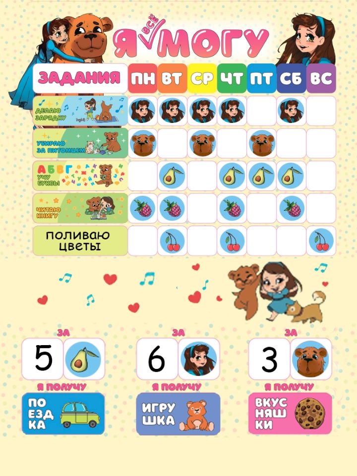 Разные цели требуют разных усилий. За семейный выезд на природу нужно ежедневно делать зарядку всю неделю. А чтобы получить любимую вкусняшку достаточно два раза в неделю полить цветы.